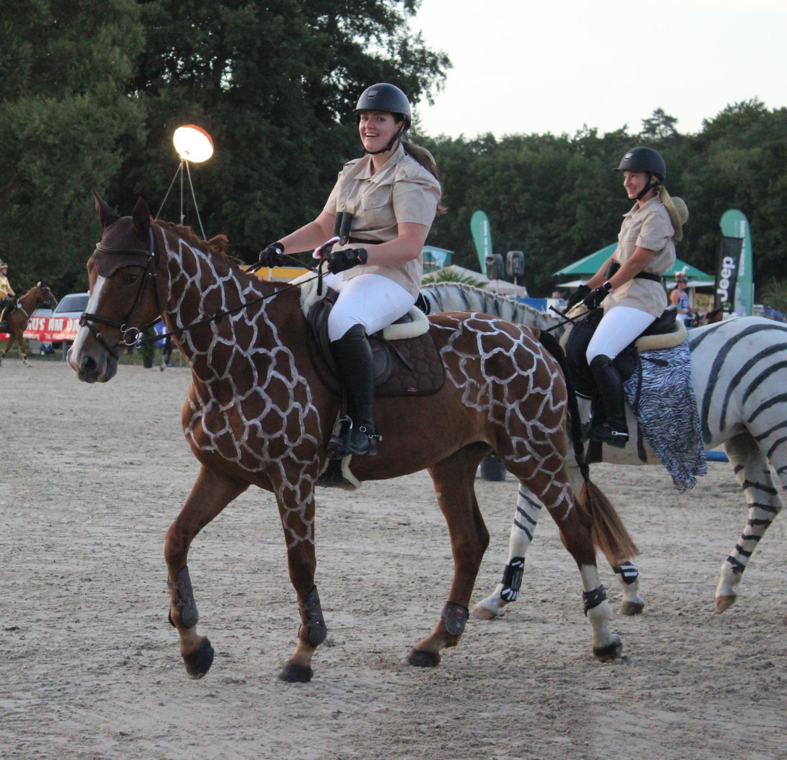 Wir hatten zwar einige große S-Prüfungen, das Highlight war aber, wie auch im letzten Jahr, unser Kostüm-Mannschaftsspringen am Freitagabend, welches teilweise mit Flutlicht stattfand. Dieses war übrigens auch nicht eingeplant, und musste dann aufgrund der langen Tage und vielen Teilnehmer noch ganz kurzfristig organisiert werden. Danke an die Feuerwehren aus Nienburg und Linsburg, die das spontan möglich gemacht haben. So waren nun also zehn tolle Mannschaften in zehn noch tolleren Kostümen angereist und drehten einige rasante Runden. Hatten sich Geschichten überlegt um die eigenen Kostüme noch besser zur Geltung zu bringen und kamen mit vielen Statisten in die Bahn und begeisterten uns und das große Publikum. Den Superhelden schien es letztes Jahr so viel Spaß gemacht zu haben, dass sie dieses Jahr gleich wieder am Start waren. Wir begegneten Charly, der original auf unserem schönen Springplatz das goldene Ticket zum Besuch in der Schokoladenfabrik zog, Bibi und Tina waren im wahrsten Sinne des Wortes mit der ganzen Familie angereist und passend zum Wetter wurde auch das Mallorca-Feeling bei uns in den Parcours geholt. Und da man unseren Springplatz durch die Farbe des goldenen Sand auch leicht mit einer Steppe verwechseln kann, bekamen wir plötzlich Trommeln zu hören und eine ganze Gruppe ging kurzerhand auf Safari und bestaunte Löwen, Krokodile, Zebras und Tiger. Winnie Pooh und seine Freunde drehten auch wieder ihre Runden und wie auf Schienen bewältigten die Lokomotivführer ohne Bremse unseren Mannschaftsparcours. Ein bisschen gruselig wurde es, als wir plötzlich von jeder Menge Geistern heimgesucht wurden, allerdings waren die Ghostbusters sofort zu Stelle und hatten schnell alles im Griff. Am Ende stellte sich auch heraus, dass die Gespenster einfach nur ein würdiges Publikum gesucht hatten um ihr Tanzkünste zur Schau zu stellen, und da waren sie bei uns ja richtig und lieferten mit einer tollen Performance richtig ab. Die flotten Bienen ritten nur zu dritt in den Parcours, machten aber ziemlich schnell klar, dass ein Streichergebnis eher etwas für Anfänger ist und rasten in einem unfassbaren Tempo mit drei fehlerfreien Ritten souverän auf Rang eins. Wahnsinn und herzlichen Glückwunsch! Am Ende wurde wie immer noch die schönsten Kostüme gekürt, wo Platz 1 dieses Jahr ans Team Safari ging, auf Platz 2 folgten die Ghostbusters und auf Platz 3 sah die Jury Charly und die Schokoladenfabrik.