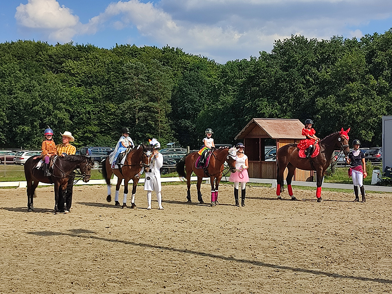 Wir hatten zwar einige große S-Prüfungen, das Highlight war aber, wie auch im letzten Jahr, unser Kostüm-Mannschaftsspringen am Freitagabend, welches teilweise mit Flutlicht stattfand. Dieses war übrigens auch nicht eingeplant, und musste dann aufgrund der langen Tage und vielen Teilnehmer noch ganz kurzfristig organisiert werden. Danke an die Feuerwehren aus Nienburg und Linsburg, die das spontan möglich gemacht haben. So waren nun also zehn tolle Mannschaften in zehn noch tolleren Kostümen angereist und drehten einige rasante Runden. Hatten sich Geschichten überlegt um die eigenen Kostüme noch besser zur Geltung zu bringen und kamen mit vielen Statisten in die Bahn und begeisterten uns und das große Publikum. Den Superhelden schien es letztes Jahr so viel Spaß gemacht zu haben, dass sie dieses Jahr gleich wieder am Start waren. Wir begegneten Charly, der original auf unserem schönen Springplatz das goldene Ticket zum Besuch in der Schokoladenfabrik zog, Bibi und Tina waren im wahrsten Sinne des Wortes mit der ganzen Familie angereist und passend zum Wetter wurde auch das Mallorca-Feeling bei uns in den Parcours geholt. Und da man unseren Springplatz durch die Farbe des goldenen Sand auch leicht mit einer Steppe verwechseln kann, bekamen wir plötzlich Trommeln zu hören und eine ganze Gruppe ging kurzerhand auf Safari und bestaunte Löwen, Krokodile, Zebras und Tiger. Winnie Pooh und seine Freunde drehten auch wieder ihre Runden und wie auf Schienen bewältigten die Lokomotivführer ohne Bremse unseren Mannschaftsparcours. Ein bisschen gruselig wurde es, als wir plötzlich von jeder Menge Geistern heimgesucht wurden, allerdings waren die Ghostbusters sofort zu Stelle und hatten schnell alles im Griff. Am Ende stellte sich auch heraus, dass die Gespenster einfach nur ein würdiges Publikum gesucht hatten um ihr Tanzkünste zur Schau zu stellen, und da waren sie bei uns ja richtig und lieferten mit einer tollen Performance richtig ab. Die flotten Bienen ritten nur zu dritt in den Parcours, machten aber ziemlich schnell klar, dass ein Streichergebnis eher etwas für Anfänger ist und rasten in einem unfassbaren Tempo mit drei fehlerfreien Ritten souverän auf Rang eins. Wahnsinn und herzlichen Glückwunsch! Am Ende wurde wie immer noch die schönsten Kostüme gekürt, wo Platz 1 dieses Jahr ans Team Safari ging, auf Platz 2 folgten die Ghostbusters und auf Platz 3 sah die Jury Charly und die Schokoladenfabrik.